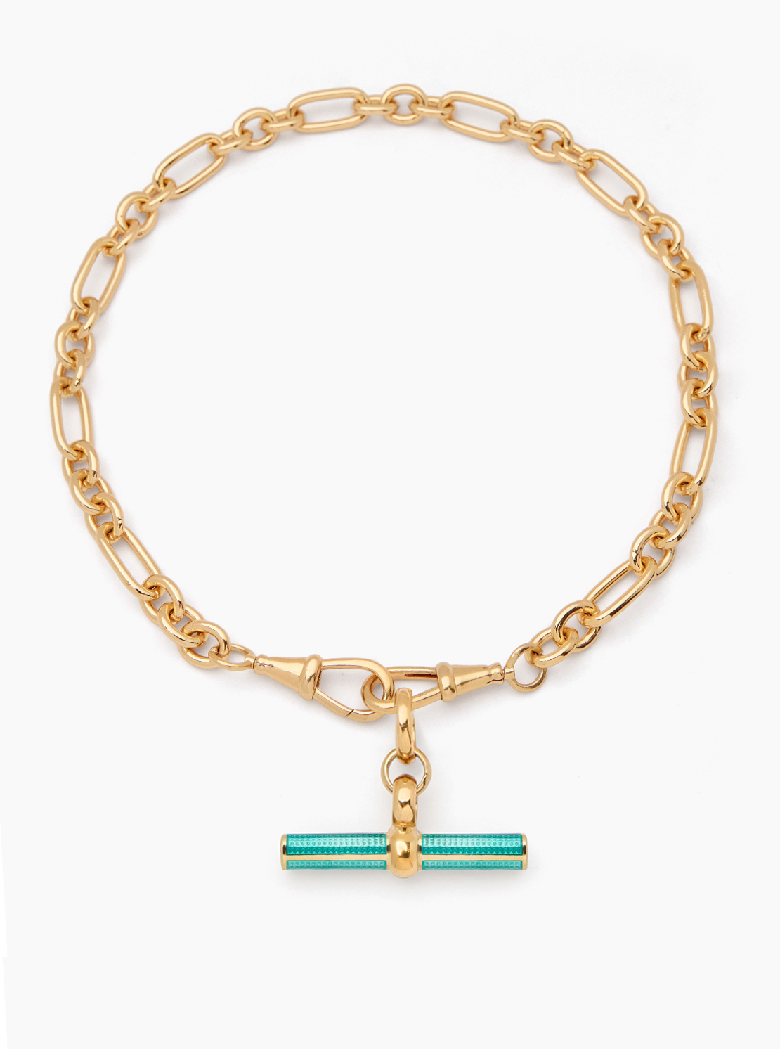 Inspired by the gentlemen’s watch chain, this necklace pays homage to not only the chain, but also the clasp. The swivel is a new addition to our collections, and almost begs to be complimented with an equally show stopping T-bar!